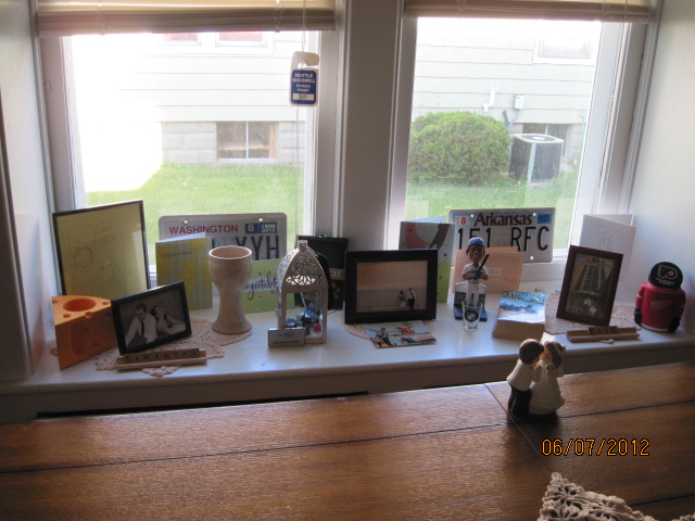 Since we technically got married three days before our ceremony, we had pictures from the courthouse framed, and they served as the centerpiece. We also included our Mariners bobble head, a Red Wings koozie, a Flyers puck, license plates from states we’ve lived in, and a few other trinkets. It was a great way to get people talking (ice breaker!), and it made the window look a little more festive than just looking over at our neighbor’s house.