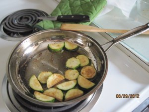 Rather than just slice up some zucchini and throw it on the pasta, though, I thought it would be fun to play with a few extra flavors, so I warmed up some oil and vinegar, threw in a little garlic and various and sundry Italian spices to cook the slices in.