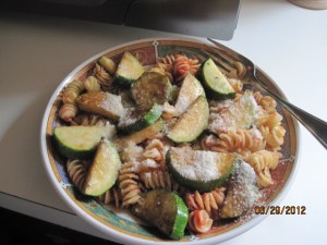 Once the zucchini was all cooked up, I nuked the pasta and topped it.