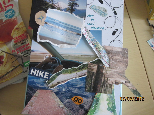 Anyway, I cut up some things and have arranged them, and I left them for a while to see how I felt about the look before pasting it down. I am still not convinced, but I don’t know what else to do.