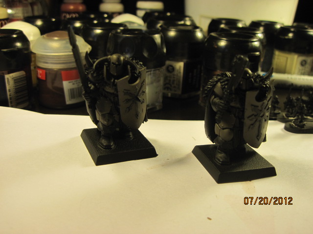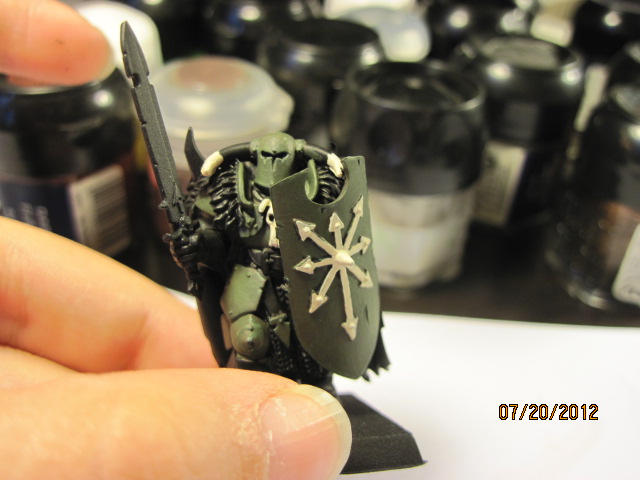 With these new paints in hand, a new unit of Chaos Warriors to paint for my Warhammer army, I decided to try some of the drab green colors and paint the unit devoted to Nurgle.