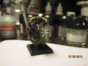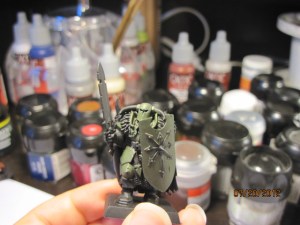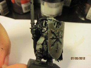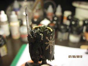 I dry brushed and highlighted the armor (and shield) with German Green, which is obviously much lighter. I didn’t like how light it was when I first tried this, but the solution was easy, and this two-tone under coat makes the final color a little more realistic.