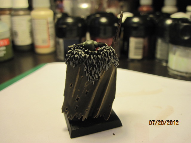 The final touches were some white tips on the fur of his cape, the highlights on the sword, shield, and leather bits. And then I painted the puss coming out of his helmet. It’s sufficiently gross.