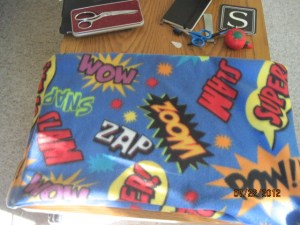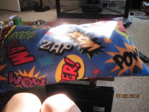 The point is that the pillow got done, and it looks very comic bookish. I believe it will match what mom has in mind for his furniture, so that’s a bonus.