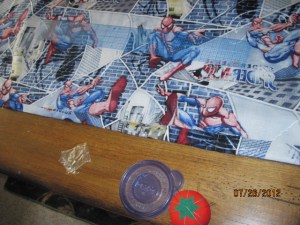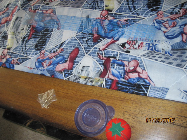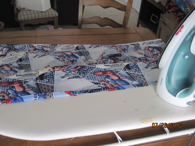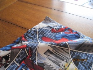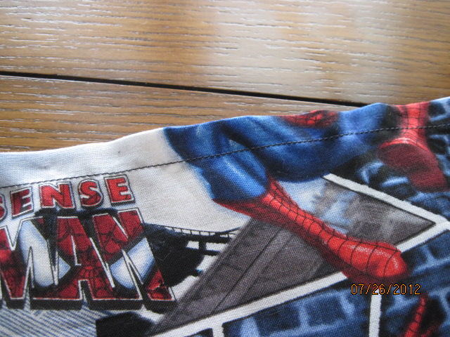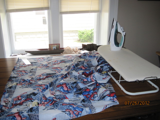 I started with fabric. I bought my fabric on Saturday; this was my second choice. I went with this Spider Man fabric because the fabric I had originally chosen was nearly gone, and they did not have enough.**