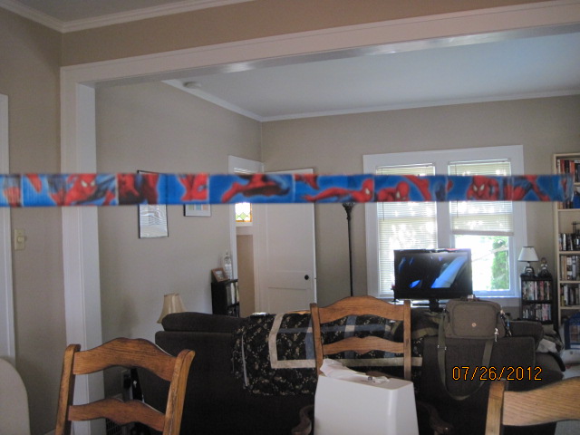 Because my brother is the best person on this planet (and I do mean that), having a plain curtain rod is not good enough for him. Luckily, I grabbed some Spider Man duck tape for my dress form project the other week, so I used that to decorate the rod. Now he has a totally Spidey curtain rod to match his curtain(s).