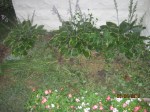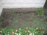 That dirt patch toward the flower boxes, that used to be where our dahlia was. The church “weeded” our garden!