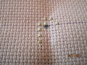 As it turns out, when you do real cross stitch, you have to make tiny, tiny stitches, one over each tiny square. You don’t skip spots or anything. So I got to pull out the thread, using the needle to move back the way it came.